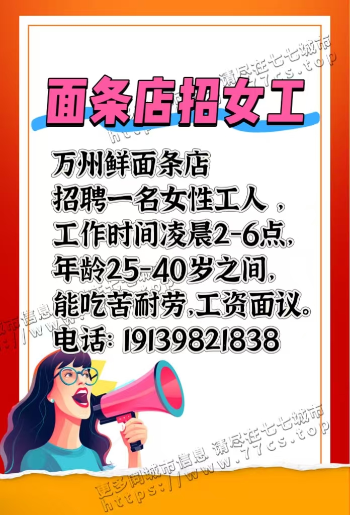 🍀面条店招聘一名女性工人 ,工作时间凌晨2-6点,年龄25-40岁之间,能吃苦耐劳 工资面议。联系电话 19139821838