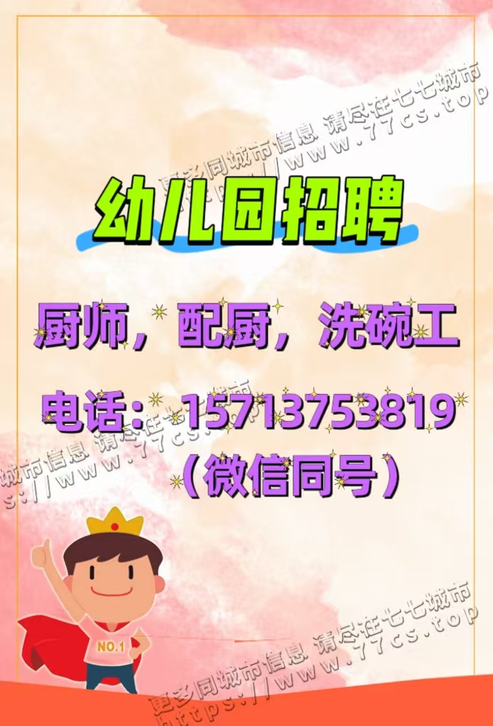 🍀 幼儿园招聘:厨师、配厨、洗碗工。电话:15713753819(微信同号)