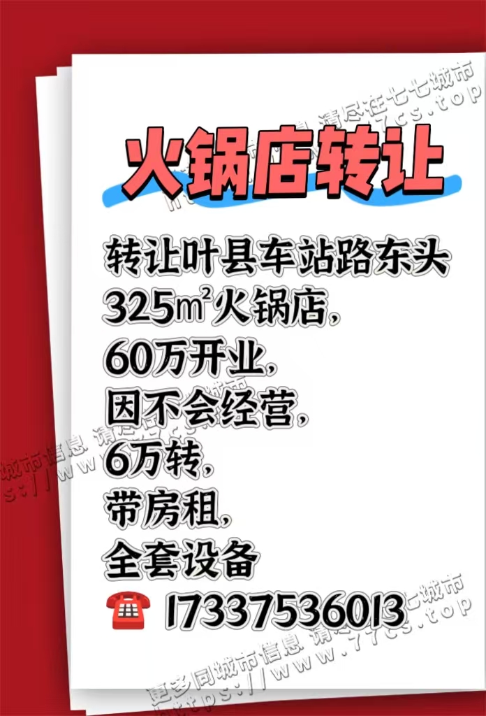 转让叶县车站路东头325㎡火锅店,60万开业,因不会经营,6万转,带房租,全套设备。17337536013