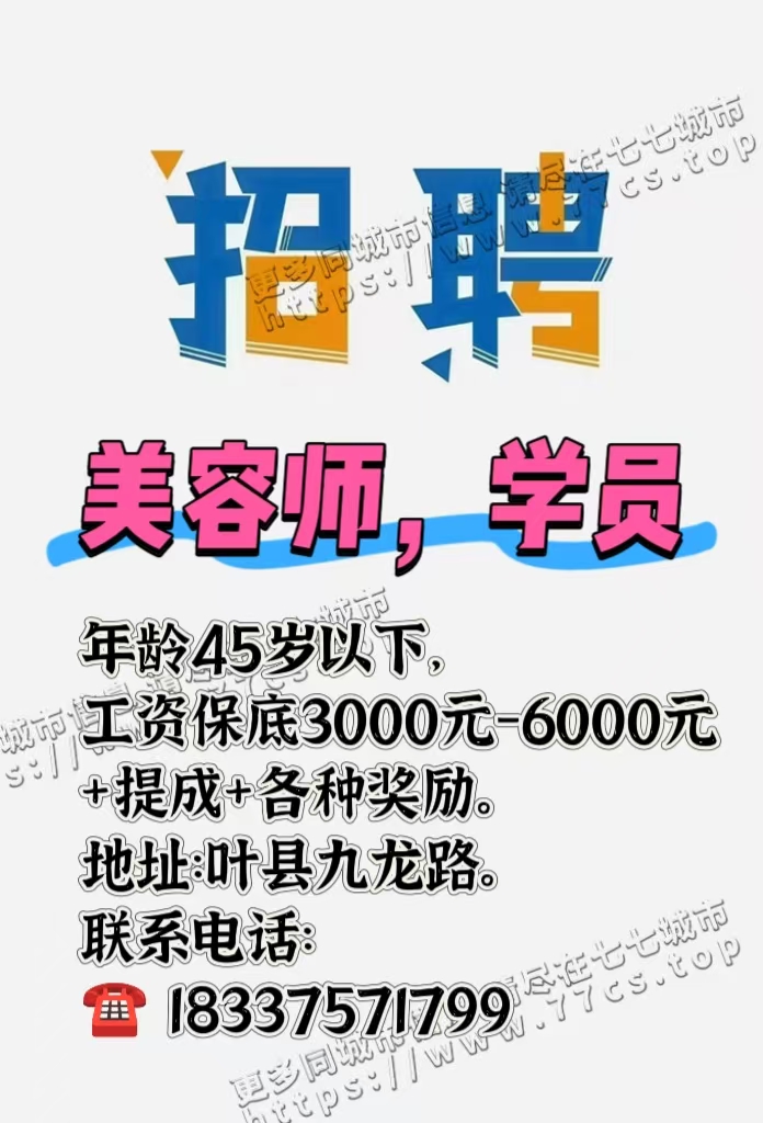 招聘: 美容师 学员 年龄45岁以下, 工资:保底3000元-6000元+提成+各种奖励。 地址:叶县九龙路。 联系电话:18337571799