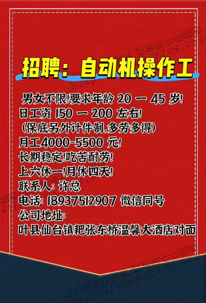 招聘:自动机操作工 3 名!男女不限!要求年龄 20 一 45 岁!日工资 150 一 200 左右! (保底另外计件制,多劳多得)月工4000-5500 元!长期稳定!吃苦耐劳!上六休一!月休四天!