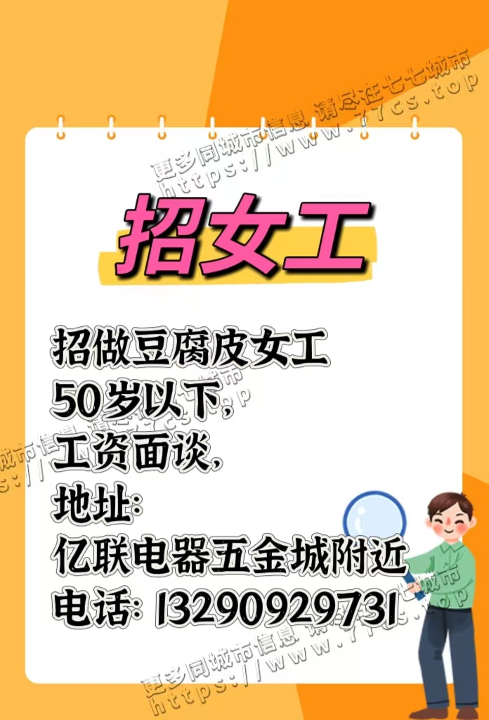 招做豆腐皮女工,50岁以下,工资面谈,地址:亿联电器五金城附近。电话:13290929731
