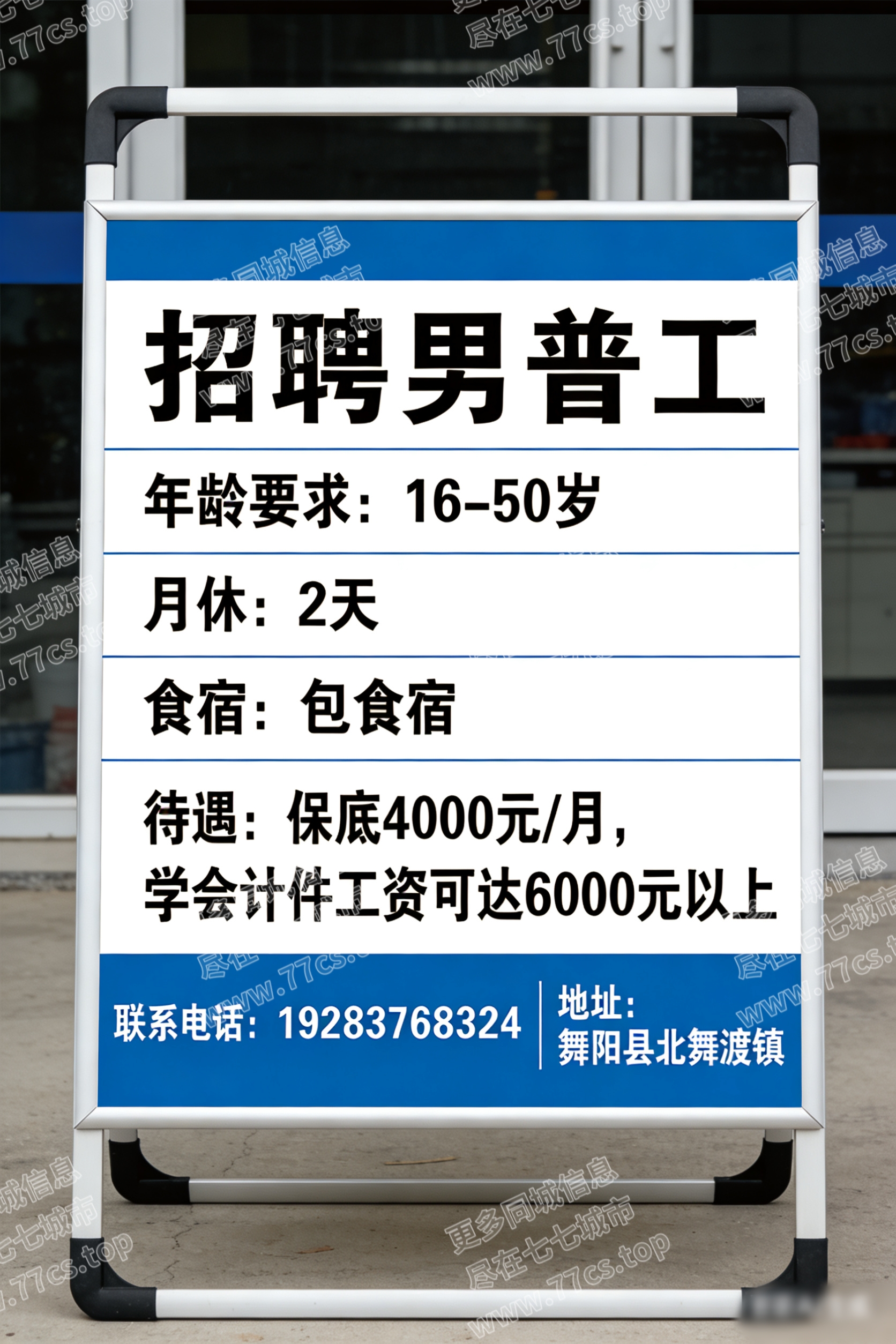 招男普工一名,年龄16到50岁,月休两天,包食宿,待遇4000保底,学会计件工资可做6000以上。电话:19283678324