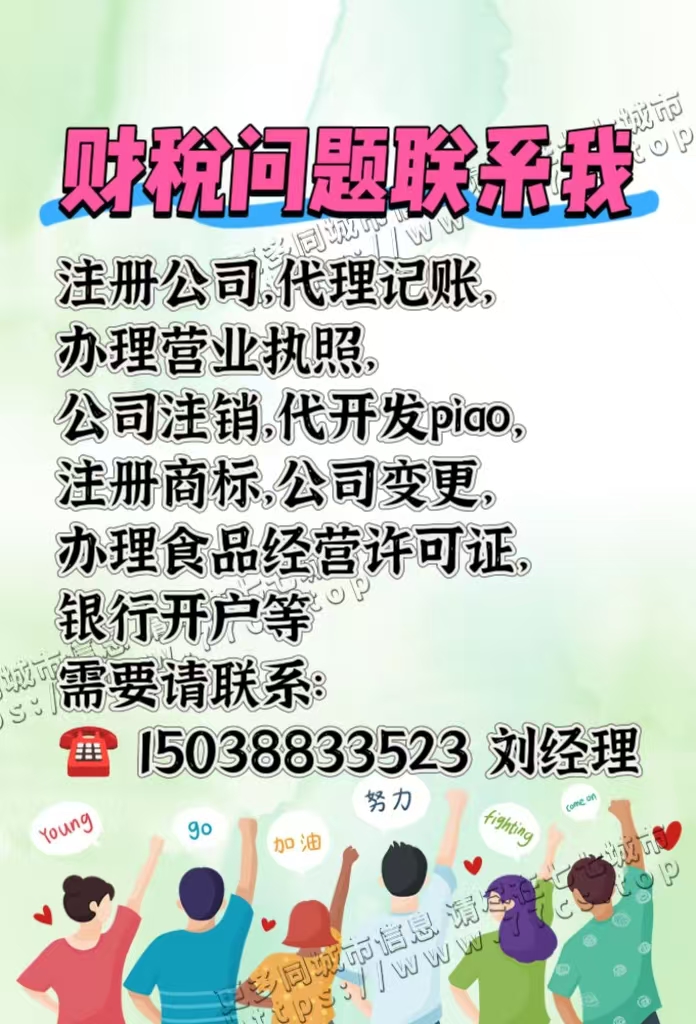 注册公司,代理记账,办理营业执照,公司注销,代开发piao,注册商标,公司变更,办理食品经营许可证,银行开户等,需要请联系刘经理。电话:15038833523