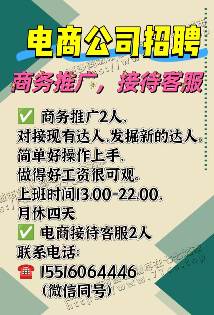 商务推广2人,对接现有达人,发掘新的达人。简单好操作上手,做得好工资很可观。上班时间13.00-22.00,月休四天