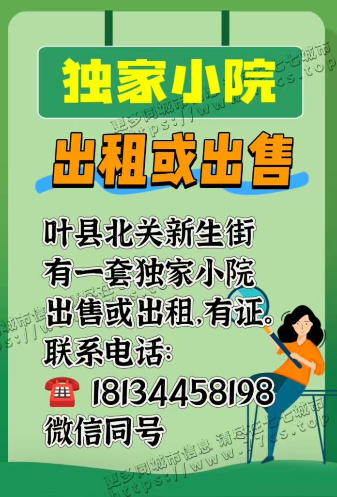 🍀叶县北关新生街现有一套独家小院出售或出租,有证。联系电话18134458198微信同号