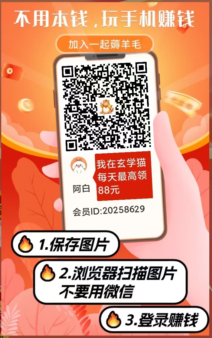 【玄学猫】手机浏览器扫码下载,注册后看几个广告,成功提现1元即可